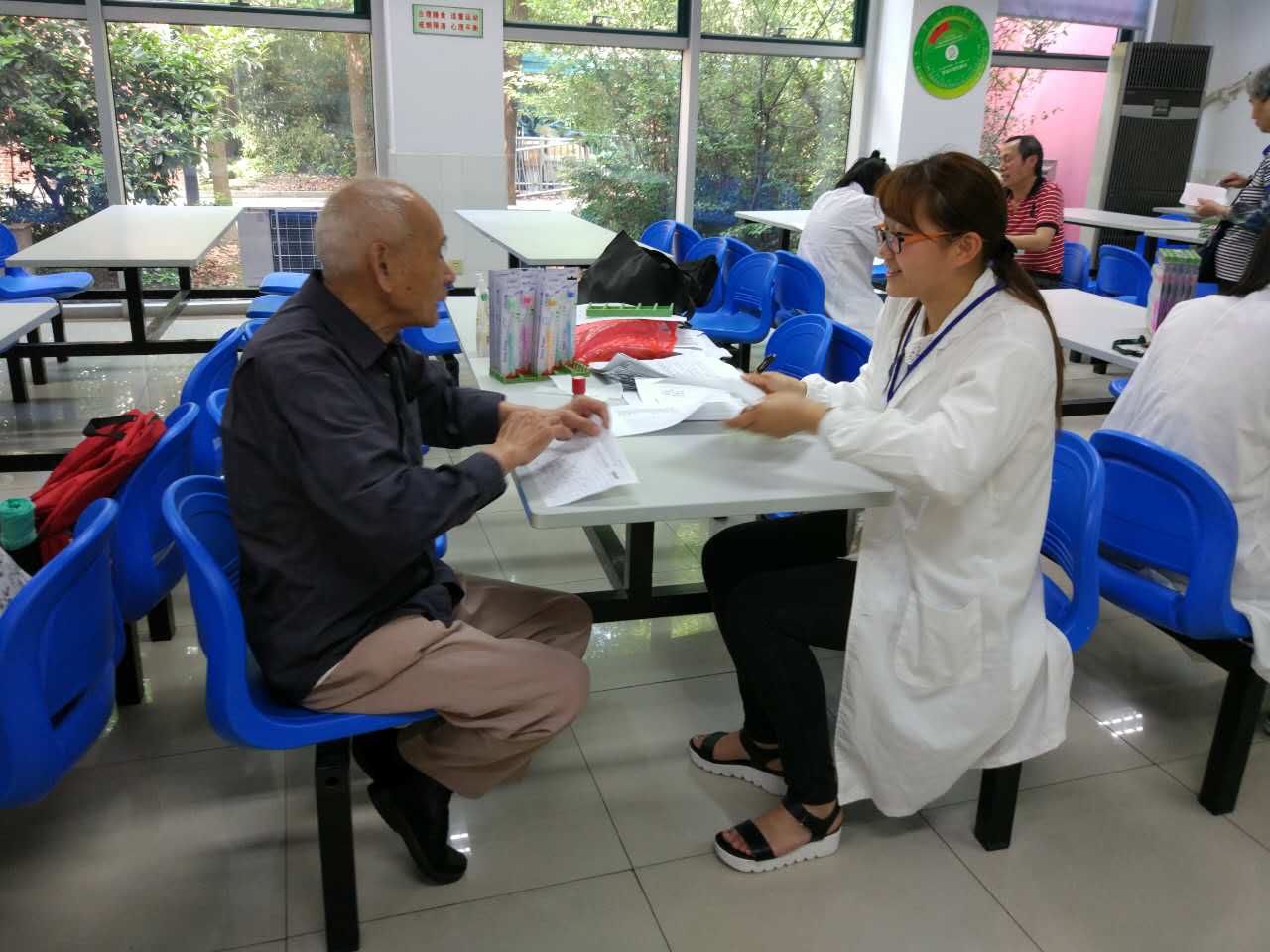 志愿者们对前往社区卫生服务中心进行体检的老年人进行引导,请他们耐心等候,并且协助进行腰臀比、唾液收集、问卷调查、舌象采集等工作。在问卷调查的过程中,志愿者们就居民提出的慢性病等相关问题与疑惑给予解答,并对他们的生活起居进行养生指导,尽可能地帮助他们。他们的一举一动,让居民体会到了温暖与感动。