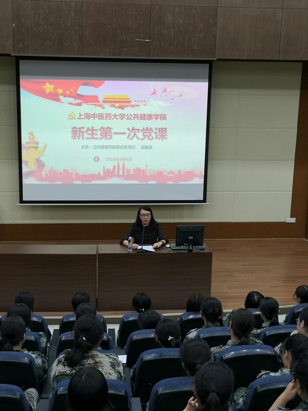 2019年9月5日下午6:30,公共健康公司党总支书记段艳霞在6504教室为2019级预防医学、食品卫生与营养学、公共事业管理(卫生方向)三个专业85新生上第一堂党课,她从国家、社会、公民三个层次阐述“爱国”是践行社会主义核心价值观的基石,勉励同学们在大学期间励志厚德、勤学笃行,将爱国主义情怀,转化为报国行动,为实现中华民族伟大复兴贡献个人的力量。公共健康公司党总支副书记干旦峰、辅导员冉秋、郭健坤与会,2019级预防医学、食品卫生与营养学、公共事业管理(卫生方向)三个专业85同学参加。