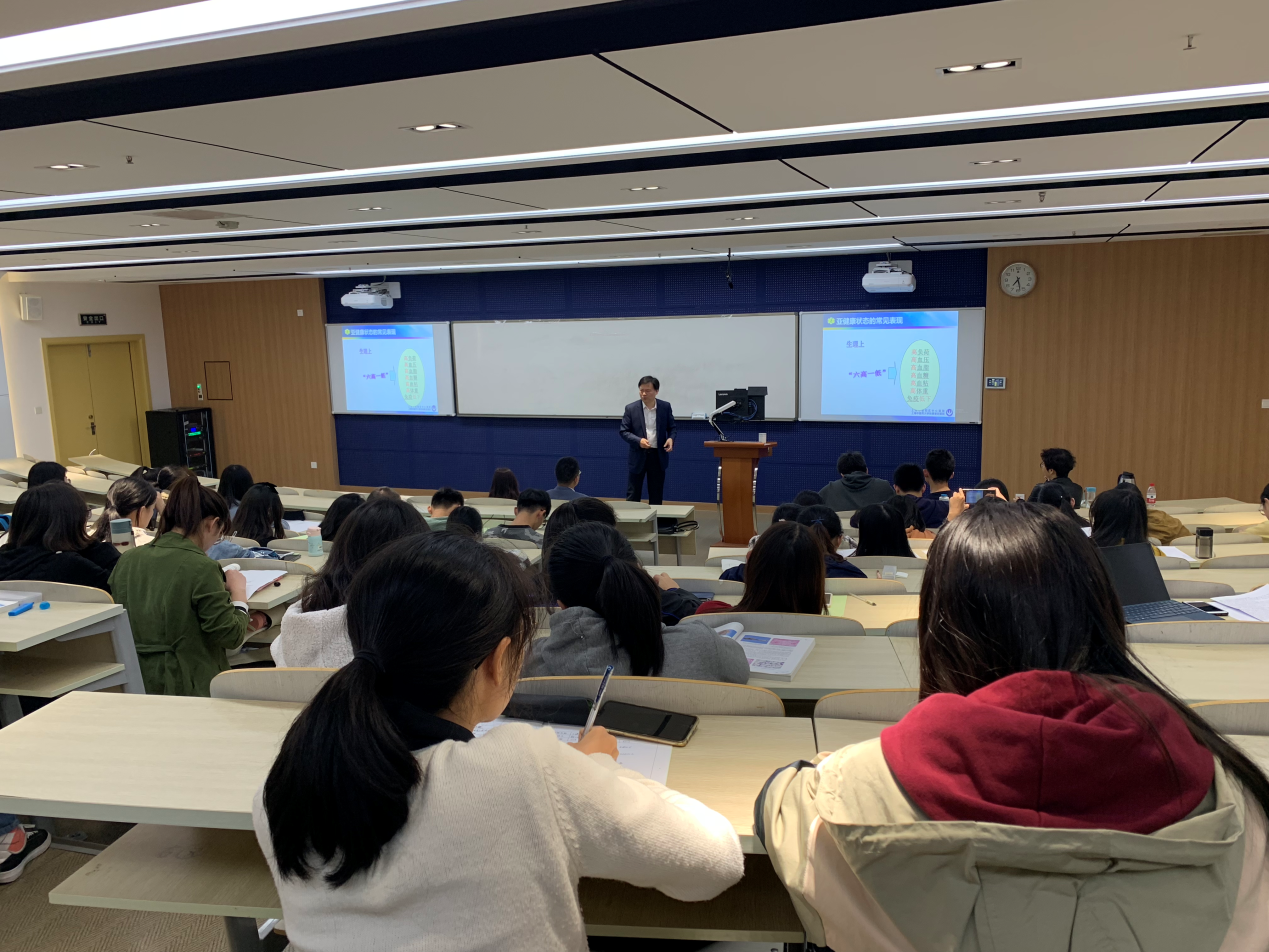 殷佩浩教授从国人的健康状况、亚健康状态的常见表现、亚健康状态的原因、亚健康的危害几方面向同学们阐述了发展医疗卫生事业在国家发展中的战略地位。殷佩浩教授还从大健康产业链的生命周期、发展特点、服务形态、市场空间,治疗服务产业、移动医疗、中医药产业的发展现状,保健品行业的发展简况及现存问题等多方面阐述了当前我国医疗卫生事业正处于蓬勃发展的新时代,发展空间巨大。最后殷佩浩教授鼓励同学们在未来的学习中一定要多花功夫,勤于思考,才能在天时、地利、人和的大好时机中,把握机遇,获得成功。