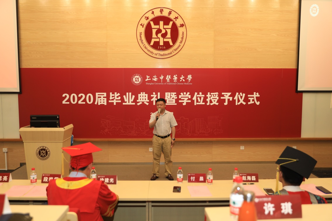 “导师团最后一课”将典礼推向了高潮,由导师代表荆丽梅和上海市疾病预防控制中心主任付晨担任主讲。荆老师以祝贺、感谢、期待为关键词,鼓励同学们抓住机遇,迎接挑战,做无怨无悔的公共健康人。她借哈佛大公司园中的一句铭文“进入校园是为了增长知识,离开校园是为了更好地为你的国家和人民服务”为寄语,殷切期望同学们在未来的求学和工作道路上,不忘初心,砥砺前行,努力为我国乃至全球公共健康事业发展做出自己的贡献。付晨主任热情欢迎和肯定“后浪”们在这样一个特殊时期,勇敢选择加入到公共卫生事业中,一定可以在这片充满希望的广阔天地中开拓疆土,施展才华,通过自身努力,创造事业的辉煌。并对毕业生提出了四点希望:一、胸怀全局。树立远大目标和宏大格局,放眼长远,不忘初心,把国家的建设和自身的发展紧密结合,与时代同步伐,与国家共命运。二、心怀感恩。感恩新时代带来的发展机遇,感恩母校、老师、父母的培养,感恩单位搭建的发展平台,汇报国家、社会、母校和家人。三、踏实进取。养成扎实靠谱的做事风格,认真学习、多工作负责,多琢磨事,少琢磨人,不夸夸其谈,更不弄虚作假,脚踏实地,久久为功,为实现人生梦想的道路执着前行。四、自信平和。无惧任何挑战和困难,凡是走正道,做一个自信的、平和的、正直的、受尊敬的人。