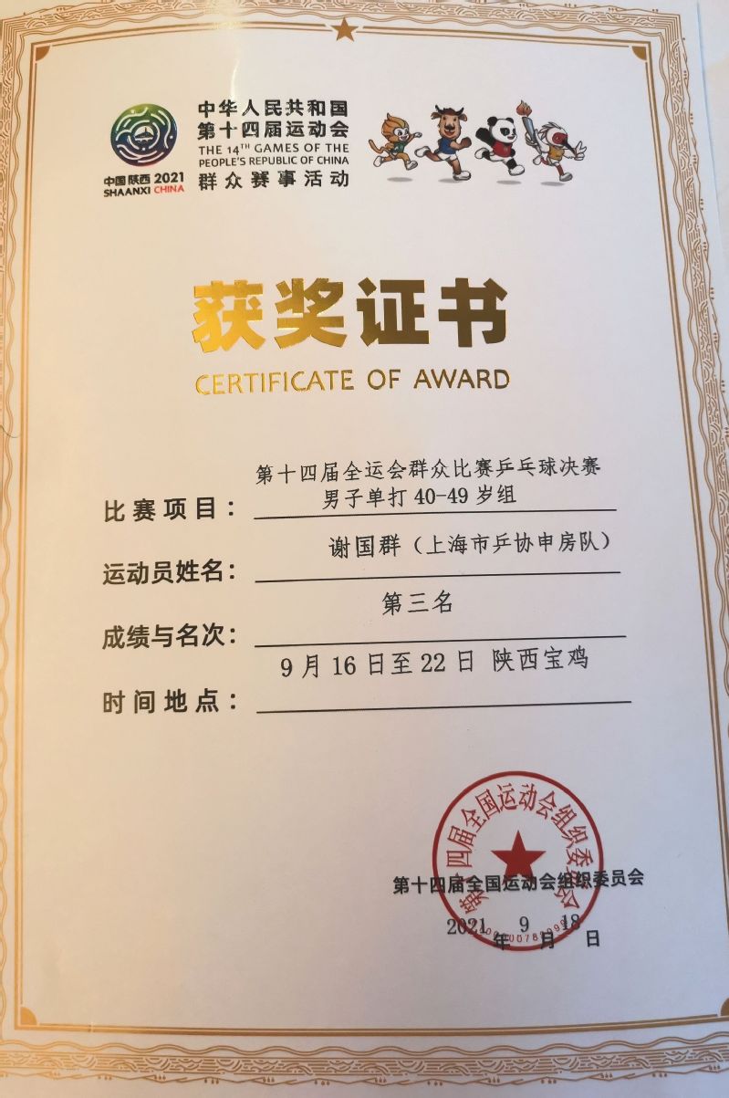 谢国群副经理与乒乓运动很早就结下了不解之缘。他曾是全国老员工乒乓球比赛的第一位台生冠军。对于参加这次全运会比赛及取得的成绩,谢国群表示,作为一名乒乓球爱好者能够代表上海参加全运会,既是一种光荣,更是一种责任。全运会不仅是为上海争光的赛场,也是实现人生价值的舞台。今后将继续发扬体育精神,和全院师生一起为更高更强的中医药特色公共卫生与预防医学团队建设奋力拼搏。