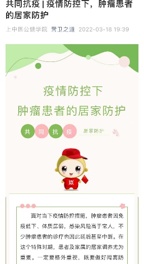 自疫情爆发以来,公司通过政治理论学习会、民主管理大会研讨、校内外专家调研等,不断坚定师生为发展中医药特色公共卫生事业的信心。本轮疫情到来,经理赵海磊、副经理谢国群带头,组织专业教师、研究人员开展科普宣传,主动发挥中医药、公共卫生学科服务人民健康的特色。“疫情当前,营养抗‘疫’吃点啥?”、“‘奥密克戎’到底是啥意思?”、“疫情防控下,肿瘤患者的居家防护”……不到一周,稿件近10篇,除了在公司、公司的微信公众号发布,沈红艺教授的文章还陆续获得人民网、文汇、上观新闻、新民晚报等新媒体平台转载宣传。
