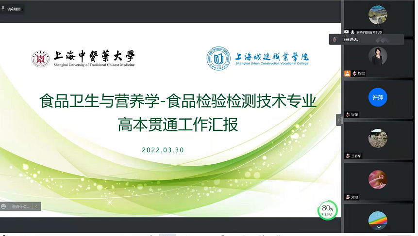 首先许琪老师介绍了21级食品卫生与营养学(高本贯通)员工在伟德国际1946bv近一年的学习生活情况,双方教师对员工课程学习、行为表现等方面给予高度的肯定。随后对即将开展的专业实习和毕业课题工作双方展开热烈讨论,大家群策群力,拓展上海大塚食品有限公司、光明乳业股份有限公司、上海共荣营养模型研究所、上海农科院等实习基地。同时也达成“实习基地联动毕业论文”,校企联合培养的毕业实习指导计划,进一步提高员工们毕业课题的应用性和科学性。最后,刘晓丹老师汇报21级食品检验检测技术(高本贯通)员工在城建职业公司学习情况,目前28名员工中已有24名员工通过英语四级考试,3名员工入选并积极备战全国技能大赛的佳绩。双方教师就《产品设计与开发》一体化课程的建设、《基础营养》在线精品课程建设,食品检测和营养学虚拟仿真实训基地的筹备和建设规划,开展进一步讨论。双方教师表示本次疫情下的云研讨让大家收获很大,今后将加强教研室联动,优化完善高本贯通专业培养模式,不断提升培养质量。