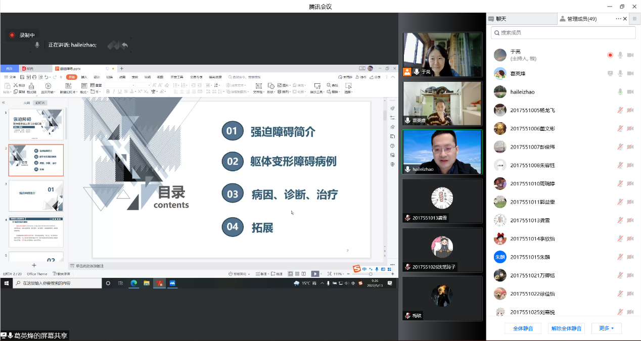 5月13日,bevitor伟德国际1946精神病学线上实习汇报交流会顺利举办,预防医学专业员工分组开展汇报,围绕8个精神病典型案例,结合病案分析和文献研究,从不同侧重点对临床精神科疾病开展深入研究。实习汇报获评审专家肯定,展现公司预防医学专业员工严谨的学风和扎实的专业能力。bevitor伟德国际1946经理赵海磊、预防医学教研室金如锋、全科医学系于亮以及2017级、2018级预防医学专业51员工参加汇报交流会。