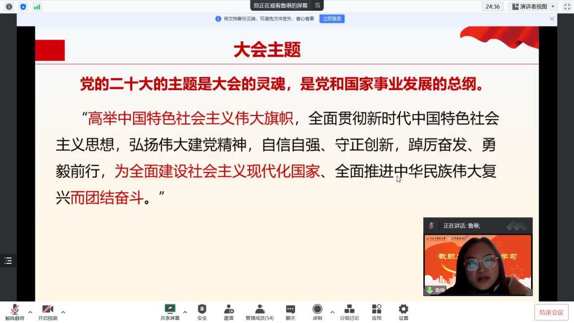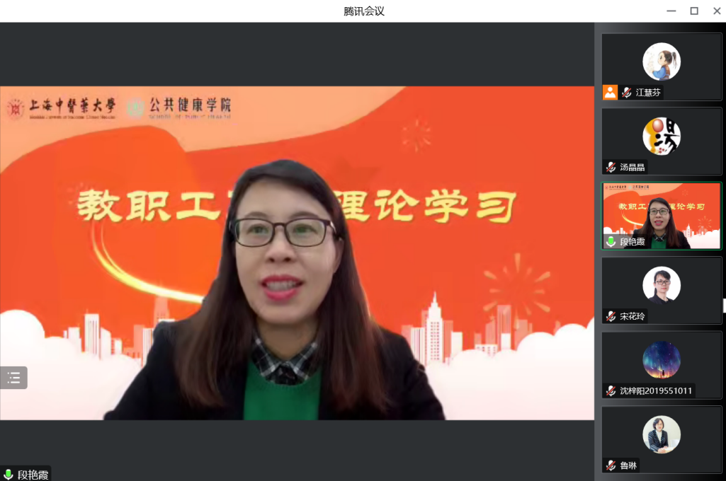 党的二十大是在我国迈上全面建设社会主义现代化国家新征程、向第二个百年奋斗目标进军的关键时刻召开的一次十分重要的大会。为进一步学习宣传贯彻党的二十大精神,把全体师生的思想统一到党的二十大精神上来,把力量凝聚到党的二十大确定的各项任务上来,12月14日下午,公共健康公司党总支组织开展政治理论学习,邀请马克思主义公司副教授、“杏马”理论宣讲团成员鲁琳老师作《“医”心向党明担当 踔厉奋进新时代》主题宣讲,全体教职工、员工党员参与线上党课学习。学习会由党总支书记段艳霞主持。