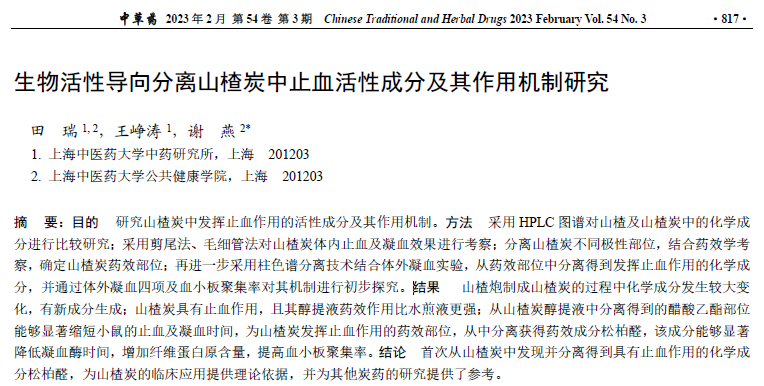 近期,公司谢燕研究员团队发表题为“Green synthesis of multifunctional carbon dots from Crataegi Fructus for pH sensing, cell imaging and hemostatic effects”的研究论文,收录于《Journal of Photochemistry & Photobiology, A: Chemistry》,该期刊主要聚焦于光与各种分子之间的相互作用、生物分子不同系统的特性描述等,JCR分区为Q2,收录于SCI/SCIE,影响因子为5.141。同时题为“生物活性导向分离山楂炭中止血活性成分及其作用机制研究”的中文论文也见刊于国内核心期刊《中草药》2023年第3期。