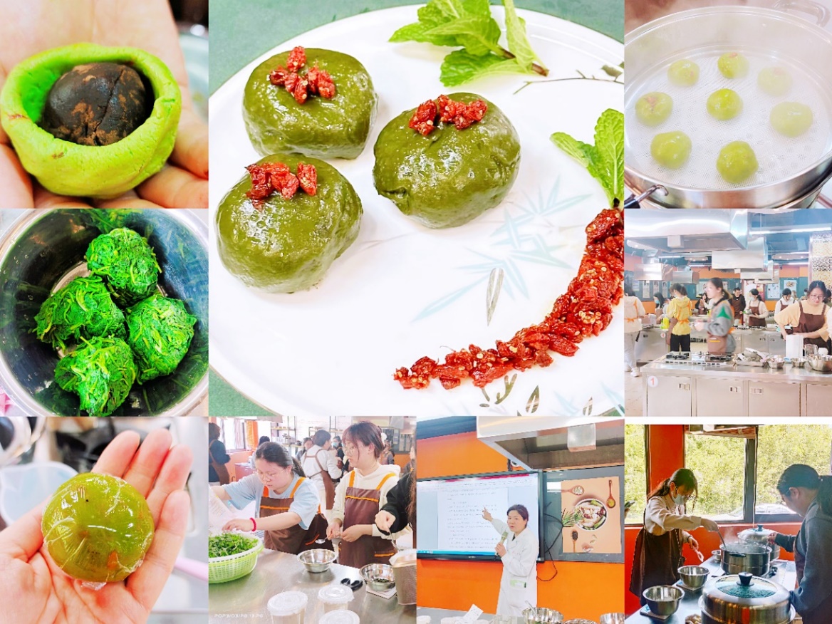 在外皮制作上,除了用传统的艾草之外,选取了药食同源的马兰头,两者混合搅打成泥,并与糯米粉、玉米淀粉以及葛粉、枸杞、山药粉、陈皮粉、茯苓粉、薏苡仁粉等混合制作成皮坯,不仅使得色彩亮丽,更具有清热健脾、明目降压等作用。在馅料制作上,选取了莲蓉、咸蛋黄肉松、豆沙和荠菜猪肉四种口味,并分别加入菊花、红枣粉、紫苏粉等药食同源食材制作成的特色馅料,赋予传统糕点别样的风味。