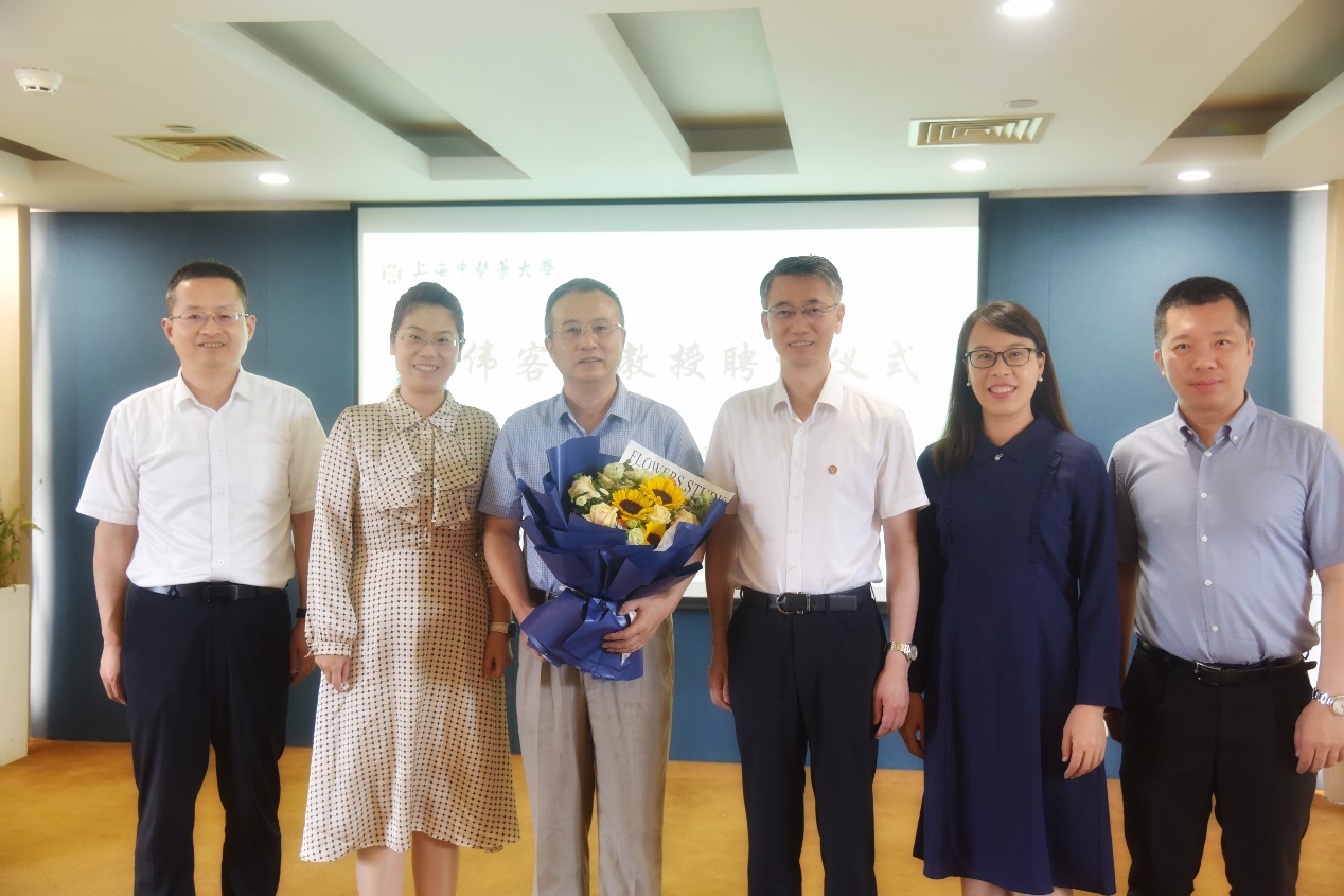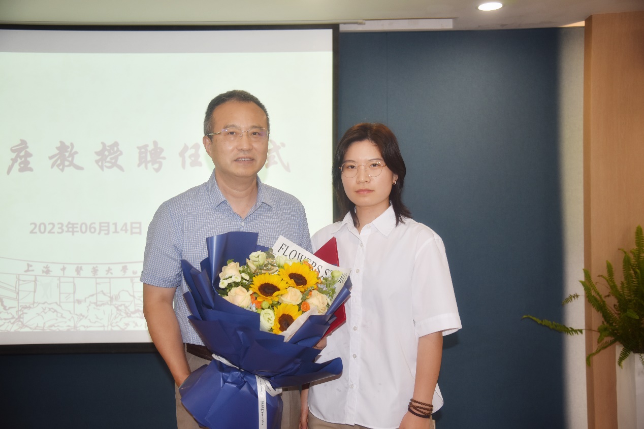 许铁峰副书记向卢伟教授颁发聘书、佩戴校徽,教师代表李倩老师献上鲜花。