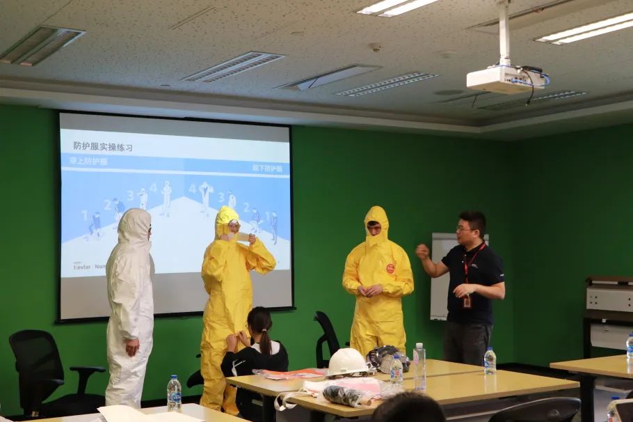 理论之外,课堂上还进行了穿脱防护服的实操练习,配合杜邦专家的现场讲解分析,普及如何正确穿脱防护装备及其重要性。