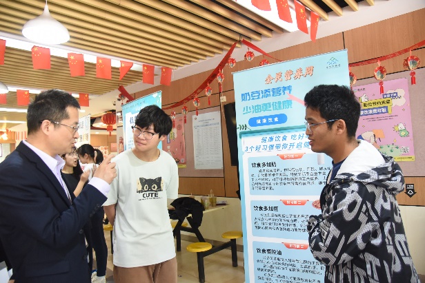 “一叠花生米有多少含油量?”“一份蛋炒饭里有多少油?”老师们向前来用餐的师生提倡“增豆、加奶、减油”,引导师生合理搭配日常膳食,养成良好饮食习惯和运动习惯,做自己健康的“第一责任人”。