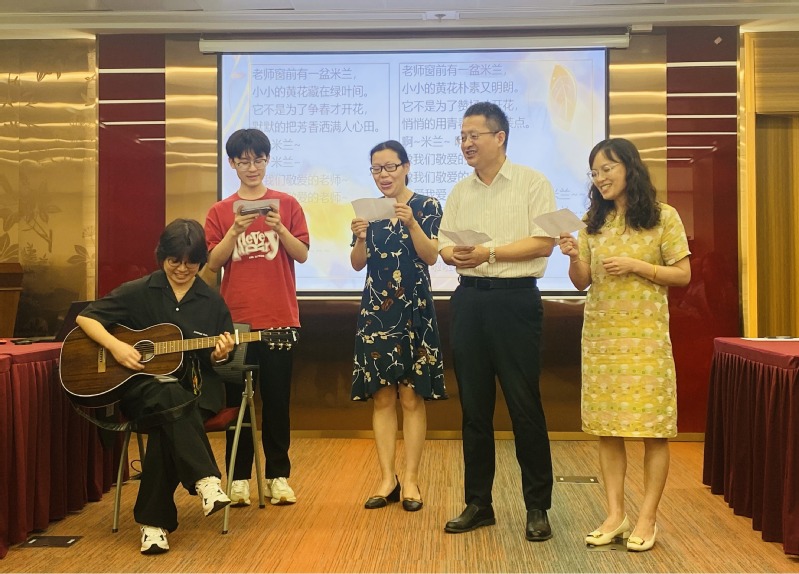 教师代表才艺展示环节将本次活动推向高潮,经理赵海磊、副书记干旦峰与汤晶晶、李倩、张翼三位老师共同献上一首上世纪八十年代、为赞颂教师培养人才呕心沥血、默默奉献精神的经典歌曲《我爱米兰》。