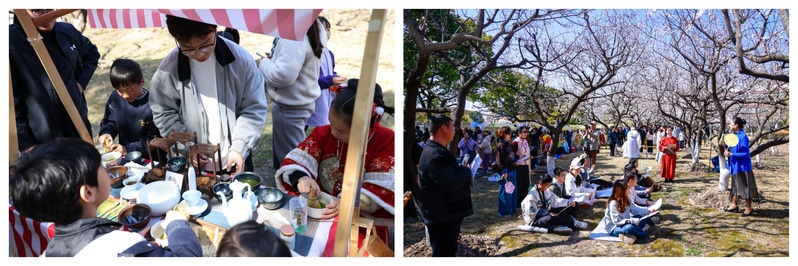 “杏林游园”是由老员工社团搭建的传统与现代交融的育人场域。活动将传统中医药技艺与青年创意相结合,通过香囊制作、中药材辨识等互动环节,使参与者在实践体验中感受杏林文化的独特魅力。同时,剪纸艺术、书法展示等非物质文化遗产项目,配合汉服展示与功法教学,为校园营造出浓厚的传统文化氛围,实现了美育教育的沉浸式体验。在杏花掩映下开展的“吟诗赏花说医药”活动中,师生把医药文化和红楼诗词结合,身心并调,领悟天人合一之境和传统文化之美,在学术交流中树立文化自信。